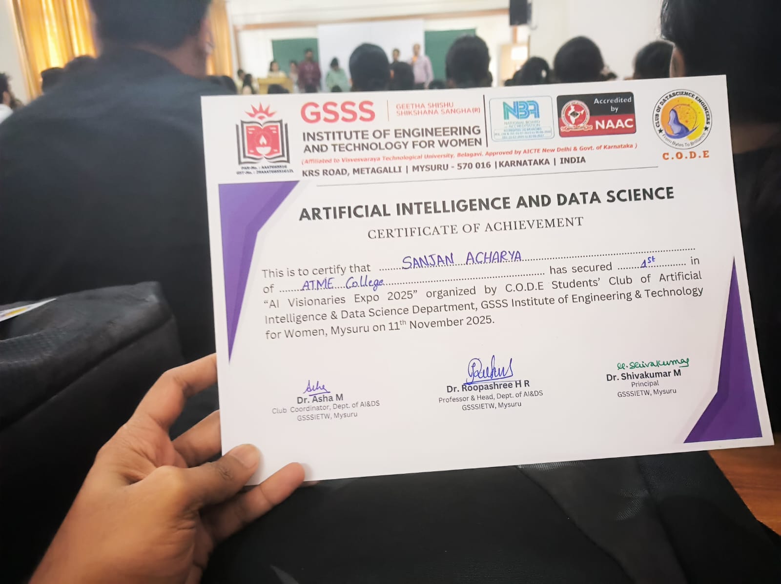 Our victory has been officially recognized with a prestigious certificate from the Department of Artificial Intelligence and Data Science at GSSS Institute of Engineering and Technology for Women. The certificate acknowledges our 1st place achievement in the AI Visionaries Expo 2025 organized by the C.O.D.E Students’ Club.